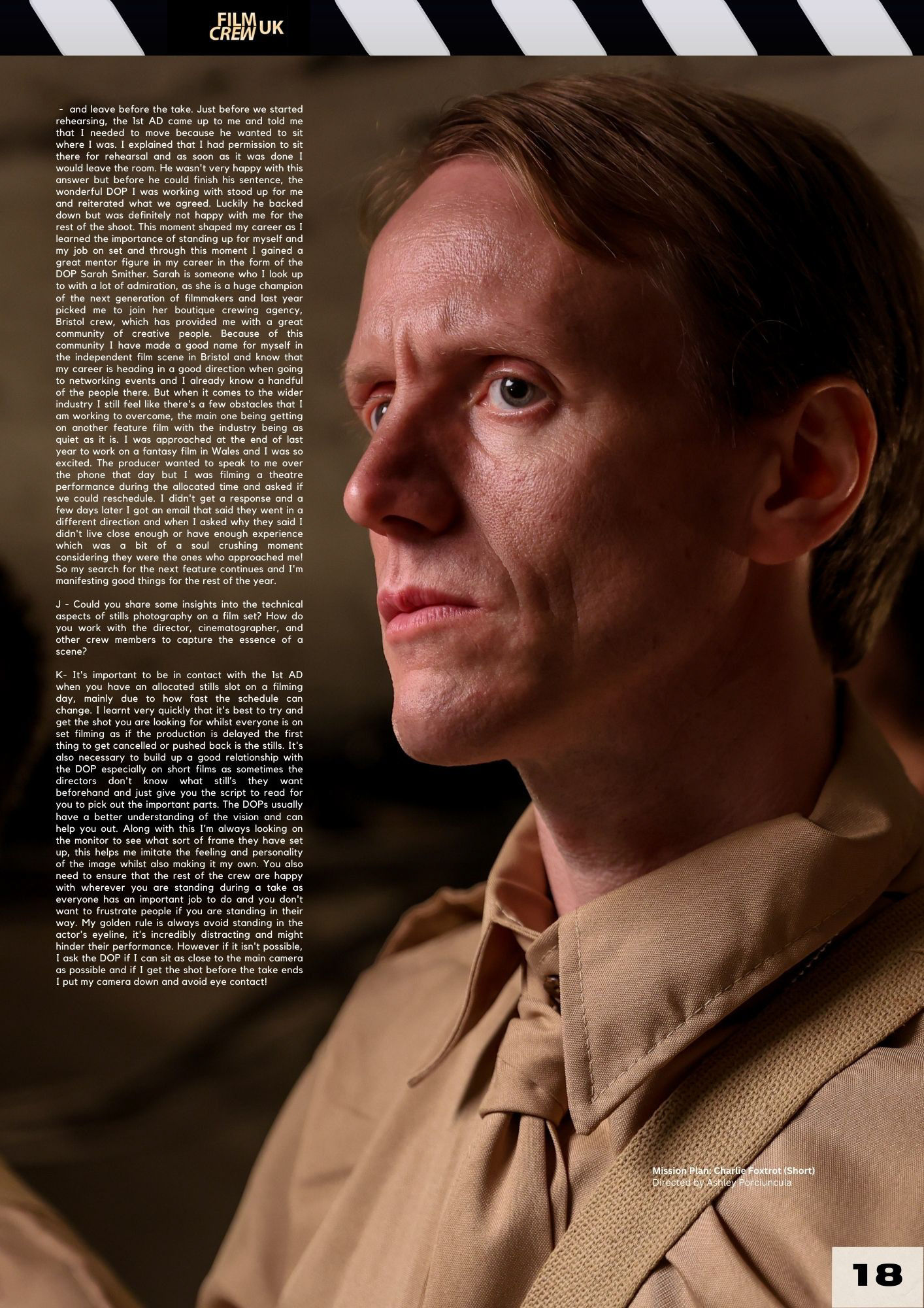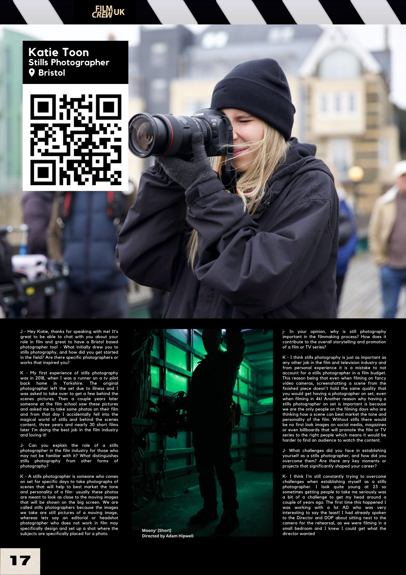 Katie's most recent work includes advertisement stills for The National Coal Mining Museum, Cambridge University and YUUP. as well as working with acclaimed actors Kevin McNally and Ed Speelers on a short film titled 'Fudge Sundae' which was directed by Georgia Redman. Katie's work has been featured in Film Crew UK's magazines Stills photographer edition, as well as in a Bristol 24/7 for an article review of The Actors Workshop's 2025 Showcase. (https://www.bristol247.com/culture/theatre/review-the-actors-workshop-showcase-the-mount-without-an-impressive-incubator-of-young-acting-talent/)