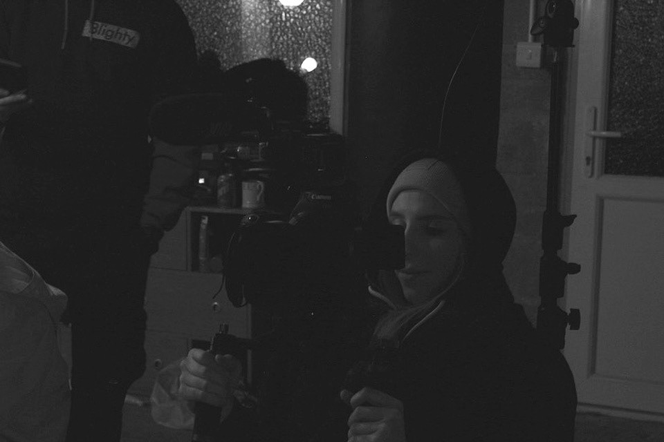 A behind the scenes photo of Katie when practicing the camera movements during the rehearsal of the fight scene. This short film required a lot of fluid camera movement, therefore she used a shoulder rig for most of the shoot so she could pan to the action. Photo by Aron Weston the stills photographer on set.